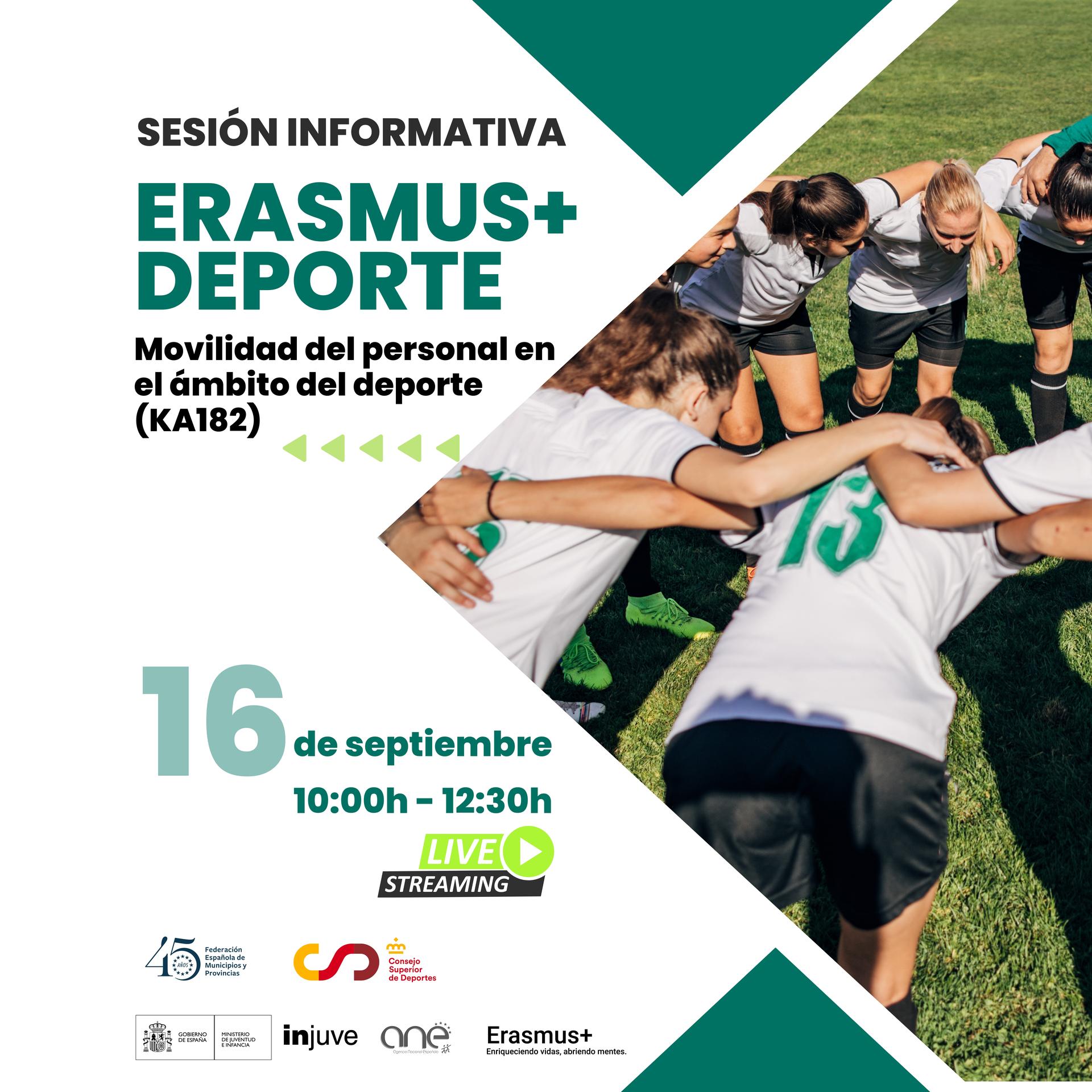 El Instituto de la Juventud (INJUVE), el Consejo Superior de Deportes (CSD) y la Federación Española de Municipios y Provincias (FEMP) han organizado una sesión informativa sobre las ayudas económicas al deporte procedentes del programa Erasmus+, en el marco de la Acción Clave 1: Movilidad del personal en el ámbito del deporte (KA182).
